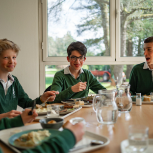 On ne va pas se mentir : quand on pense « cantine d’internat », on imagine des plateaux gris et des haricots verts tristes. Ici, c’est tout l’inverse. Un chef cuisinier prépare des repas maison avec des produits frais. Les élèves mangent avec appétit, et — détail charmant — ils invitent un professeur différent chaque jour à s’asseoir avec eux. On a goûté. C’était très bon.